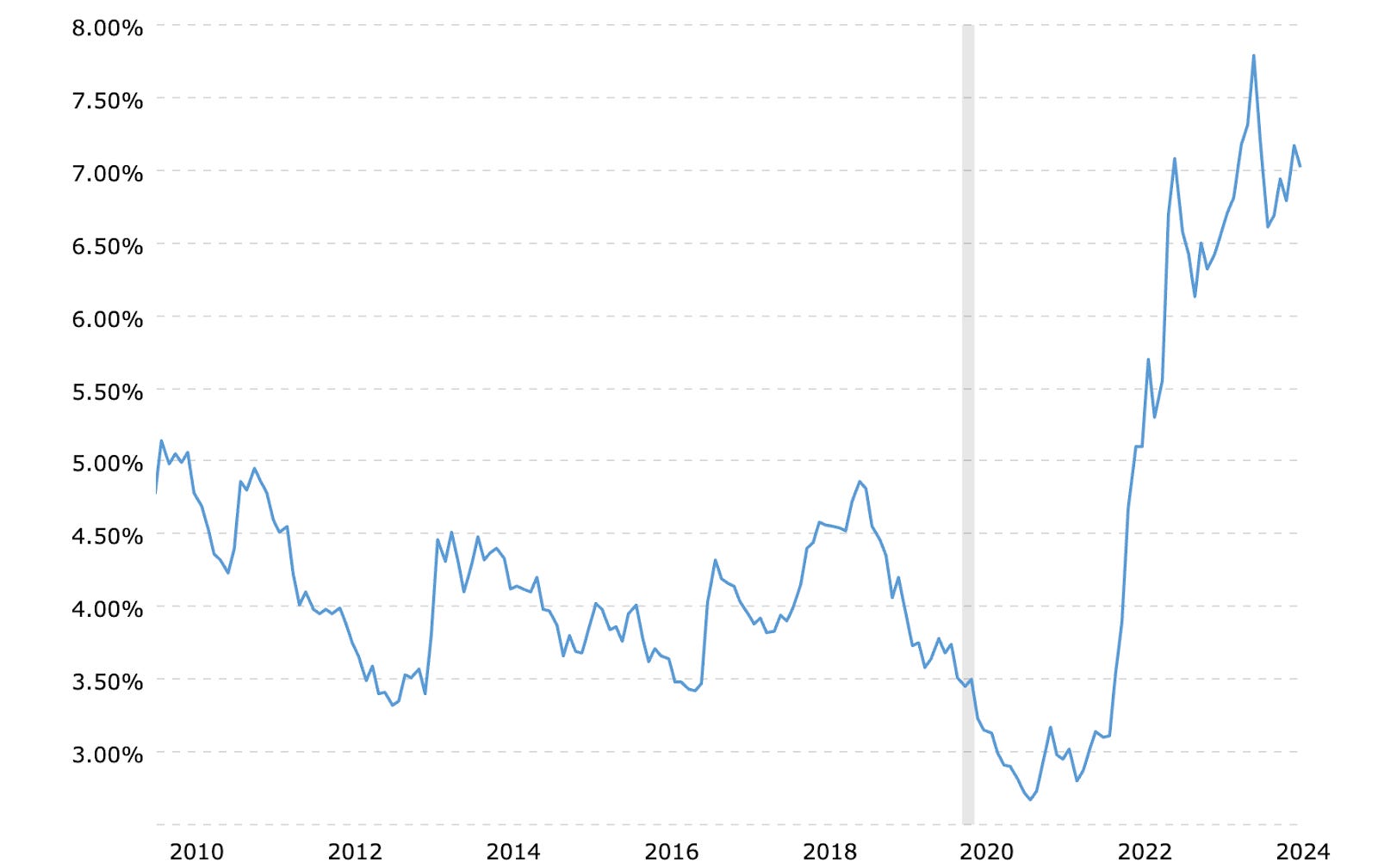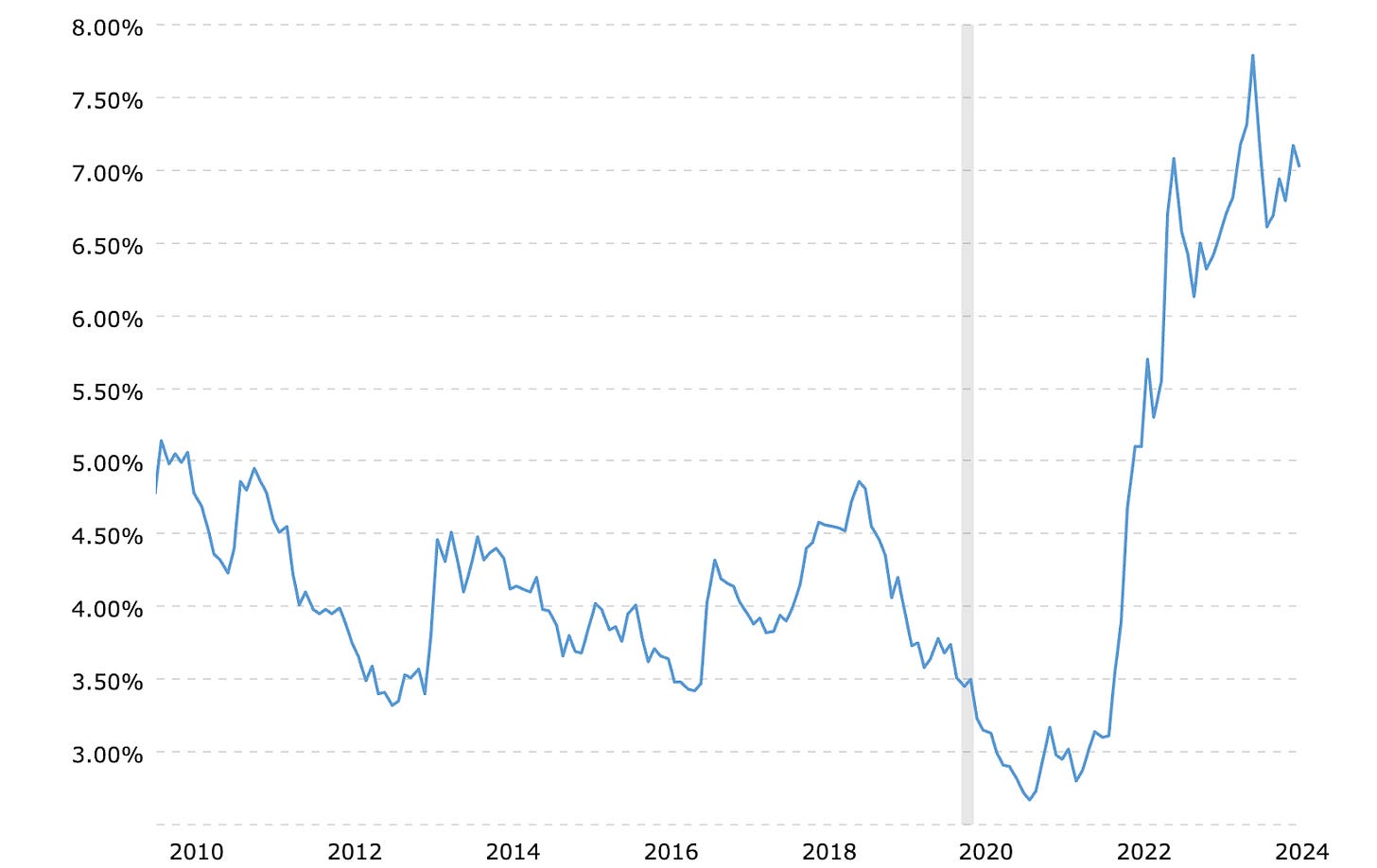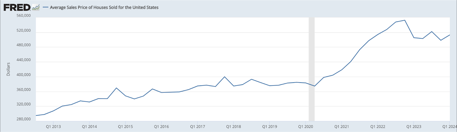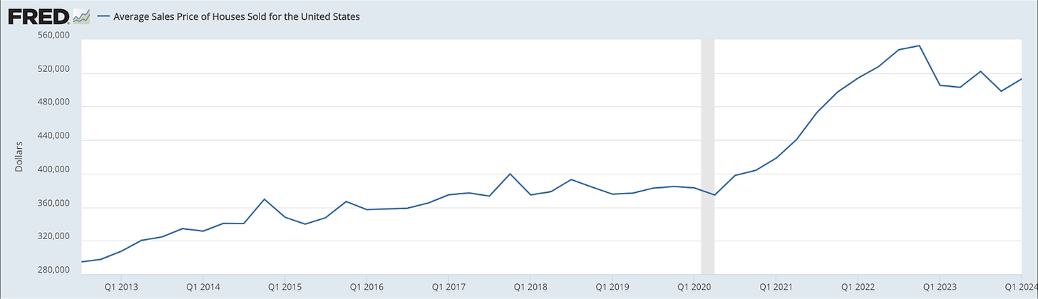 Common logic would have us believe that all this supply must have meant low prices for renters. But, this spending spree created a positive feedback loop of high inflation and increasing home prices. High inflation meant looming interest rate hikes (first graph) and massive home buying activity meant the average sales price of a home almost doubled between 2012 and 2022 (notice where it started picking up).