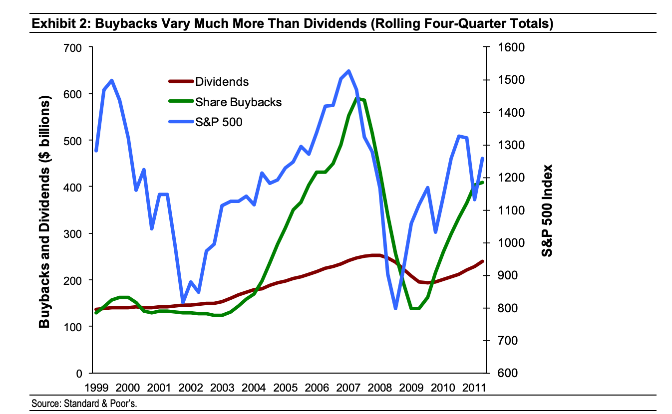 Here’s another neat statistic that displays how an index is generally affected by a buyback. Share buybacks tend to follow the index in a lagging sort of way. Buybacks increase after the market already peaked, meaning a surge of buybacks could actually be a red flag for Apple itself and the overall market.