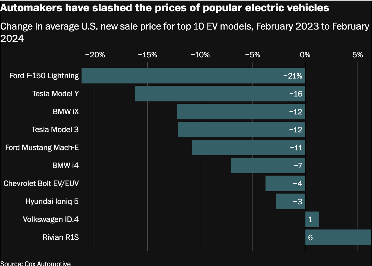 Many attribute this demand vacuum to the lack of a cost effective car and a limiting charging network, but is this truly the reason? Take a look at the graph showing the change in EV prices between February 2023 to February 2024.