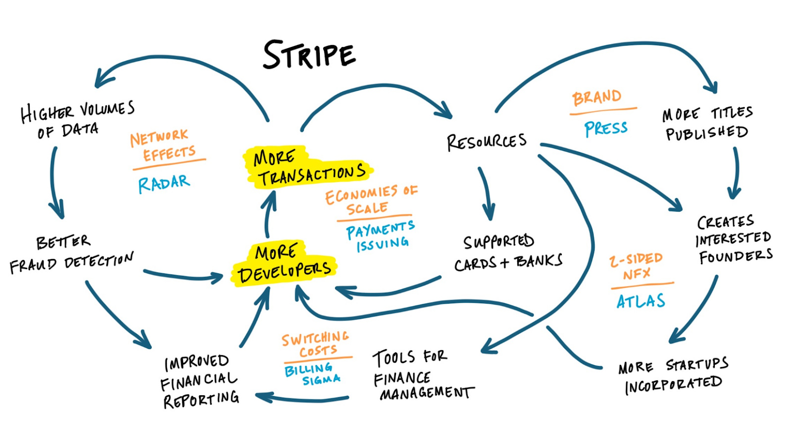 It is fair to say Stripe does not want to be seen as a competitor to any of these companies. The company’s vision is literally to “grow the GDP of the internet”. How do they do this? This value flywheel courtesy of Coleman McCormick summarizes it best: